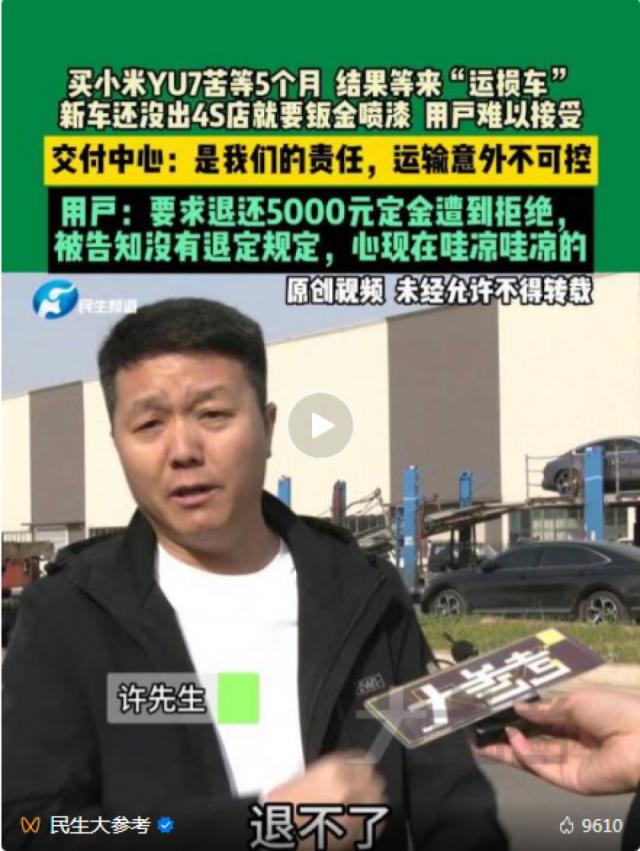 对此,小米交付中心承认是运输过程中的责任,并提出三套方案:修复车辆加补偿 1 万积分 ; 重新排产同款 ; 或从外地调拨。许先生均不满意,不愿继续等待或接受可能的问题车辆,遂要求退还 5000 元定金,但被以"公司无此规定"为由拒绝。